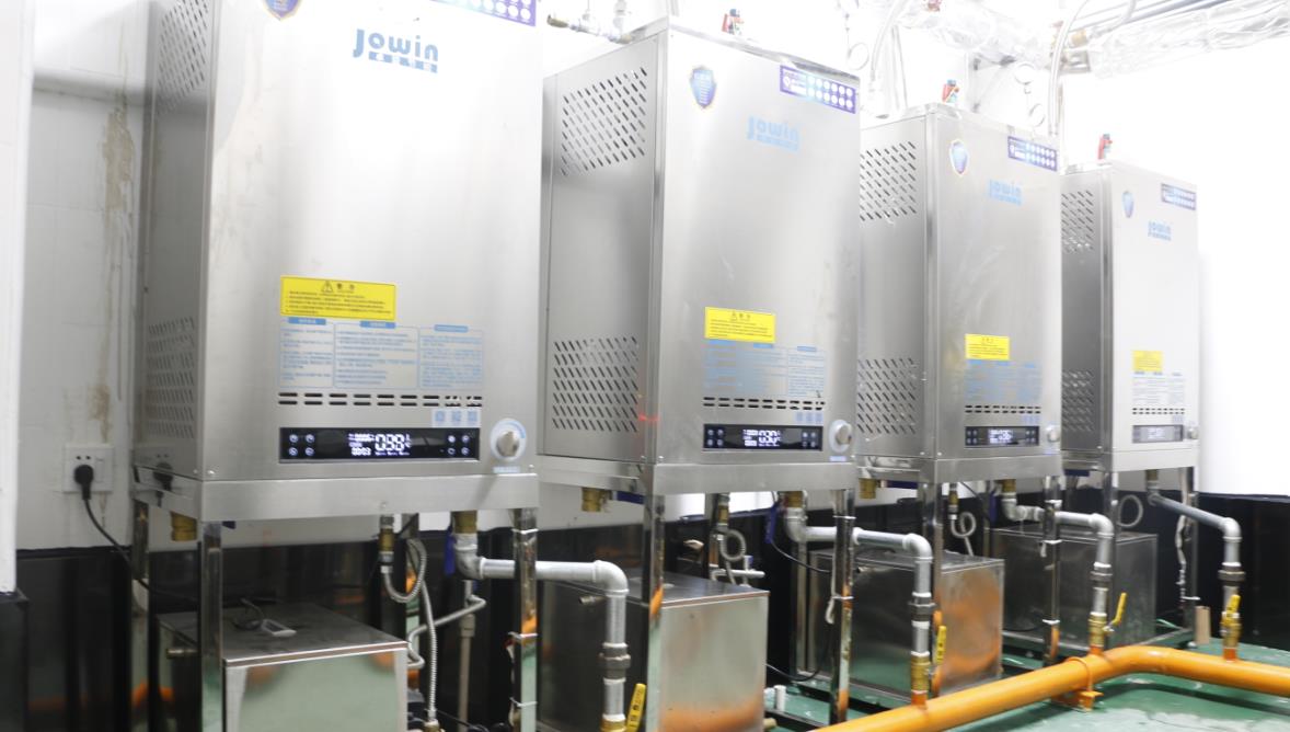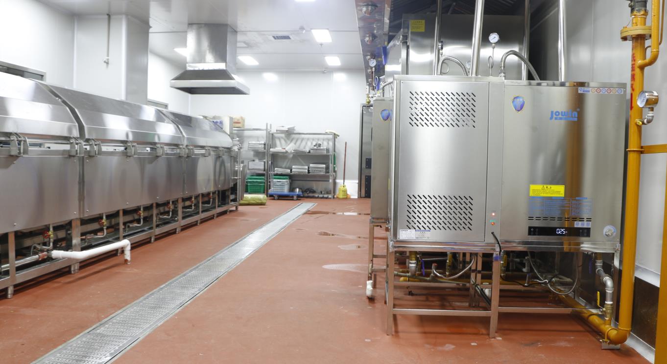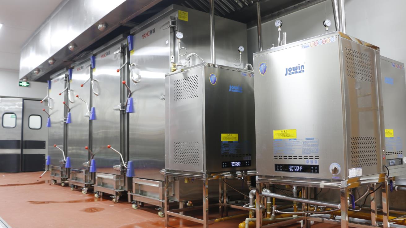 大和豐中央廚房采用8臺模塊式蒸汽發(fā)生器配套自動化米飯生產線,蒸汽溫度高達150℃,蒸汽壓力可達3公斤,4臺高溫蒸汽機配套推車式蒸箱,為深圳中小學生供餐保駕護航。