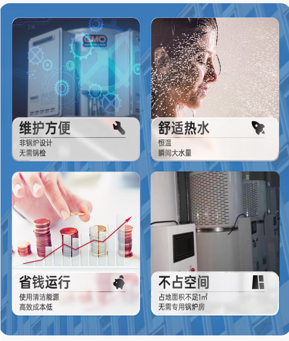 卓益商用系列燃?xì)馊莘e式熱水爐,整機(jī)由燃燒器、脈沖控制器、比例閥、膨脹罐、增壓泵、水膽、風(fēng)機(jī)等要件構(gòu)成。運(yùn)用最新燃燒換熱技術(shù)設(shè)計(jì)制造,一鍵操作,智能控制,使用液化石油氣、天然氣等氣體燃料,快持續(xù)產(chǎn)生大量熱水。設(shè)備自動(dòng)運(yùn)行,可單機(jī)或多機(jī)組合使用,適用于中小型集中熱水項(xiàng)目。